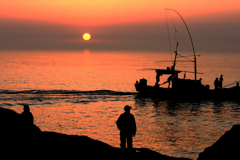 画面中,夕阳似一轮金黄圆盘,悬于海平面上方,将海面染成一片绚烂橙红,波光粼粼。一艘渔船静静停靠在海面上,渔民的身影在船上忙碌着,船边还有人在岸边伫立,可能是等待着归来的亲人。整个场景在夕阳余晖的笼罩下,充满了温暖与宁静,也展现出渔民生活质朴而真实的一面。