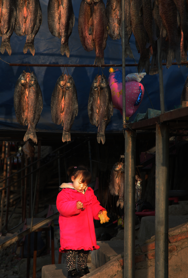 这张名为《丰收季节》的照片拍摄于20254月江苏骆马湖。画面中,一排排晾晒的鱼高高挂起,鱼的数量较多,显示出丰收的景象。暖色调的阳光洒在鱼身上,泛着光泽。下方,一个穿着鲜艳红色外套的小女孩出现在画面中,她专注于手中的事物,为画面增添了一抹灵动的气息。背景中的简易棚架和周边环境,展现出当地质朴的生活场景,整体氛围充满了丰收的喜悦与生活的烟火气。