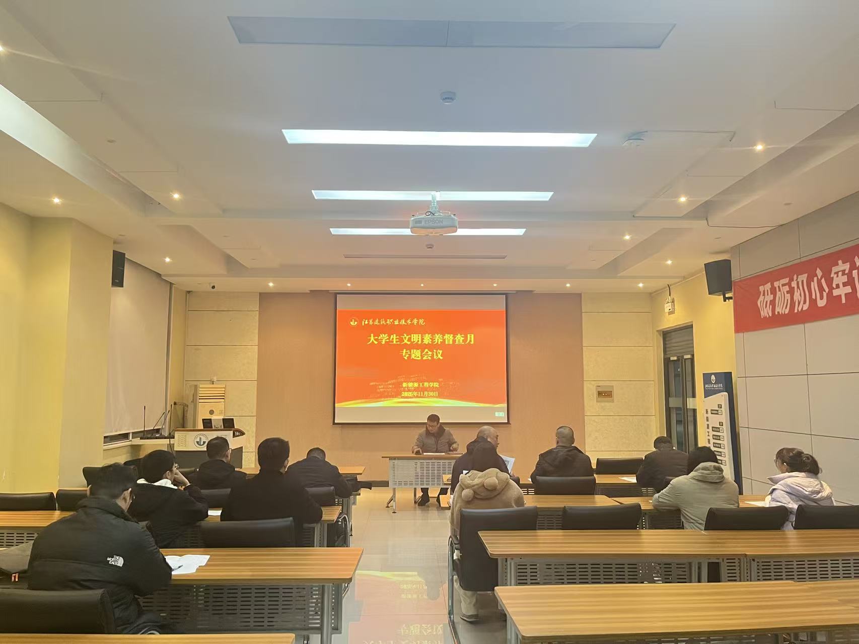 为深化校园文明建设,全面提升学生文明素养,营造崇德向善的校园氛围,11月30日,新能源工程学院在建筑技术馆202召开大学生文明素养督察月专题会议。学院党总支副书记胡兵及全体班主任老师参会,围绕督察月工作重点与实施举措深入研讨,为培育学生文明素养精准蓄力。
