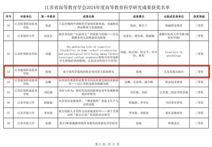 根据《关于公布2024年度高等教育科学研究优秀成果奖的通知》(苏高教会〔202525号),我院张刚博士主持的《基于现代学徒制的校企协同育人机制研究》获得江苏省2024年度高等教育科学研究优秀成果奖二等奖,此次评选由江苏省高等教育学会组织,共收到全省97所高校推荐的论文、著作和报刊文章等459项,最终评选出特等奖9项、一等奖22项、二等奖129项,合计奖项160项。
