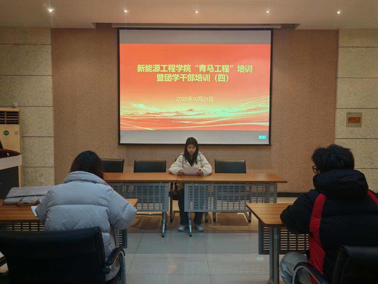 近日,新能源工程学院青马工程培训第四讲在学院会议室举行。为深化“学赛融合”育人成效,本次培训特别邀请学院优秀学生赵迎迎担任主讲人,向青马学员分享以赛促学的实践经验与成长感悟。